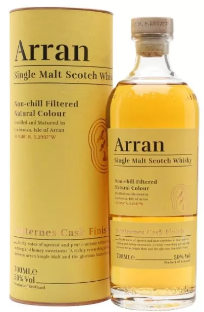 Az Arran Sauternes Cask Single Malt Scotch Whisky egy különleges single malt kiadás, amely az Arran Distillery egyedi érlelési folyamatát tükrözi. Ez a whisky a híres Sauternes boros hordókban való érlelés során kapott egyedi karaktert, amely a skót whisky és a francia borászatok hagyományait ötvözi.Általános Jellemzők:Típus: Single Malt Scotch Whisky.Kiszerelés: 0,7 liter.Érlelés: Az Arran Sauternes Cask Single Malt a whisky alapérlelését követően Sauternes boros hordókban kap végső érlelési fázist. A Sauternes borok, melyek édes, botrytizált borok, hozzájárulnak az ital gazdag, édes karakteréhez.Ízjegyek: Az ízprofil gazdag és komplex, ahol a skót whisky tradicionális maláta ízét az édes Sauternes borok jegyei egészítik ki. A whisky ízében érezhetőek a szárított gyümölcsök, méz, vanília, karamell és fűszeres árnyalatok. Az érlelés során kialakult ízek harmonikusan keverednek, ami egy sima és gazdag ízélményt nyújt.Aroma: Az illatában a Sauternes borok édes jegyei dominálnak, mint a méz, vanília és szárított gyümölcsök. Az aroma gazdag, édes és enyhén fűszeres, a maláta és a tölgyes tónusok kiegészítik az élményt. Az illat intenzív és vonzó.Lecsengés: Hosszú és gazdag, ahol az édes gyümölcsös és vaníliás jegyek folytatódnak, és a karamell és fűszeres tónusok is megjelennek. A lecsengés sima és harmonikus, ami hosszú ideig megmarad a szájban.