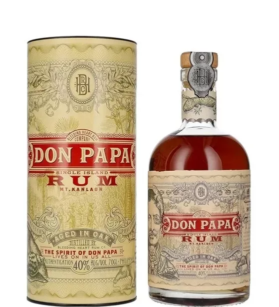 Don Papa Rum egy népszerű és prémium rum, amelyet a Fülöp-szigeteken készítenek. Ez a márka különösen a gazdag ízvilágáról és a szigeti hagyományok iránti tiszteletéről ismert. A Don Papa Rum a rumkedvelők körében népszerű, és különleges karaktert ad a rumtörténethez.Főbb jellemzők:Származás: Fülöp-szigetek, ahol a rumot a Negros szigetén található lepárló készíti. A Don Papa Rum a helyi cukornád és a szigeti hagyományok felhasználásával készül.Érlelési folyamat: A Don Papa Rum alapanyaga a helyi cukornádból készült melasz. A rumot amerikai tölgyfahordókban érlelik, amelyek hozzájárulnak a rum ízvilágához és karakteréhez. Az érlelés során a rum gazdagodik és fejlődik, ami hozzájárul a végső ízélményhez.Ízprofil: A Don Papa Rum ízvilága gazdag és édes, amelyben megjelennek az érett gyümölcsök, mint például a banán és az aszalt szilva, valamint a vanília, karamell és fűszeres tónusok. Az amerikai tölgyfahordók által hozzáadott finom tölgyes jegyek is jelen vannak. Az ízek jól harmonizálnak egymással, és a rum lecsengése sima és elegáns.Aroma: Az aroma gazdag és vonzó, ahol az érett gyümölcsök, vanília, karamell és enyhe fűszeres jegyek dominálnak. Az illat komplex és meghívó, ami jól tükrözi az érlelési folyamat által nyújtott karaktert.Szín: Mély borostyánszínű, amely az érlelés során kialakult színt és gazdagságot tükrözi. A szín gazdag és intenzív, és egyértelműen jelzi a rum prémium minőségét.-Érdekel a Don Papa rumok titka? Részletek a BLOG oldalon »