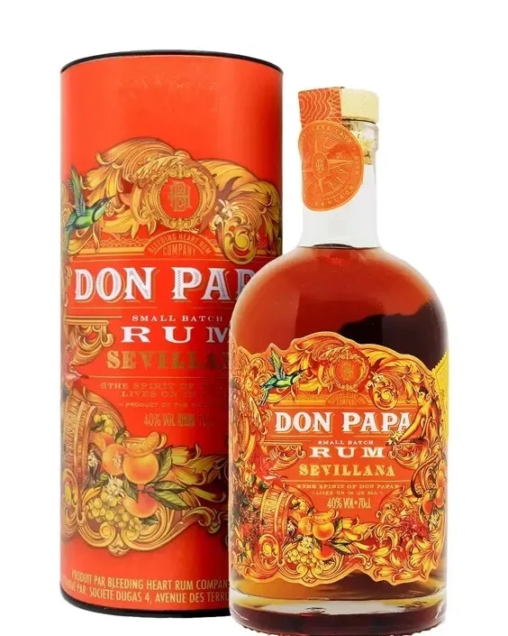 A Don Papa Sevillana egy limitált kiadású, prémium rum a Fülöp-szigetekről, amely különleges hordós érlelésének köszönhetően egyedülálló aromákat kínál. Ez a rum először ex-bourbon hordókban, majd andalúz Oloroso sherry és narancsbor (Vino de Naranja) hordókban érlelődik, különösen gazdag és komplex ízvilágot eredményezve.Jellemzők:Származási hely: Fülöp-szigetekŰrtartalom: 0,7 literAlkoholtartalom: 40%Érlelés: bourbon, sherry és narancsbor hordókbanLimitált kiadásKóstolási jegyzetek:Szín: mély borostyánIllat: édes narancslekvár, vanília, szegfűszeg, fahéj, pörkölt tölgyÍz: gazdag és gyümölcsös, narancs, aszalt szilva, mazsola, méz, fekete csokoládé, fűszeres jegyekLecsengés: hosszú, meleg és gyümölcsös-fűszeresFogyasztási ajánlás:Legjobban tisztán, szobahőmérsékleten érvényesülKiváló desszertek mellé vagy étcsokoládéval párosítvaKoktélként is különleges, például egy Rum Old Fashioned változatbanEz a különleges tétel a Don Papa világának egyik legegyedibb darabja, amely minden rumkedvelő gyűjteményében méltó helyet érdemel.